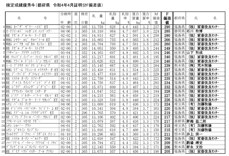 検定成績優秀牛 -都府県 令和4年04月証明分F偏差値-